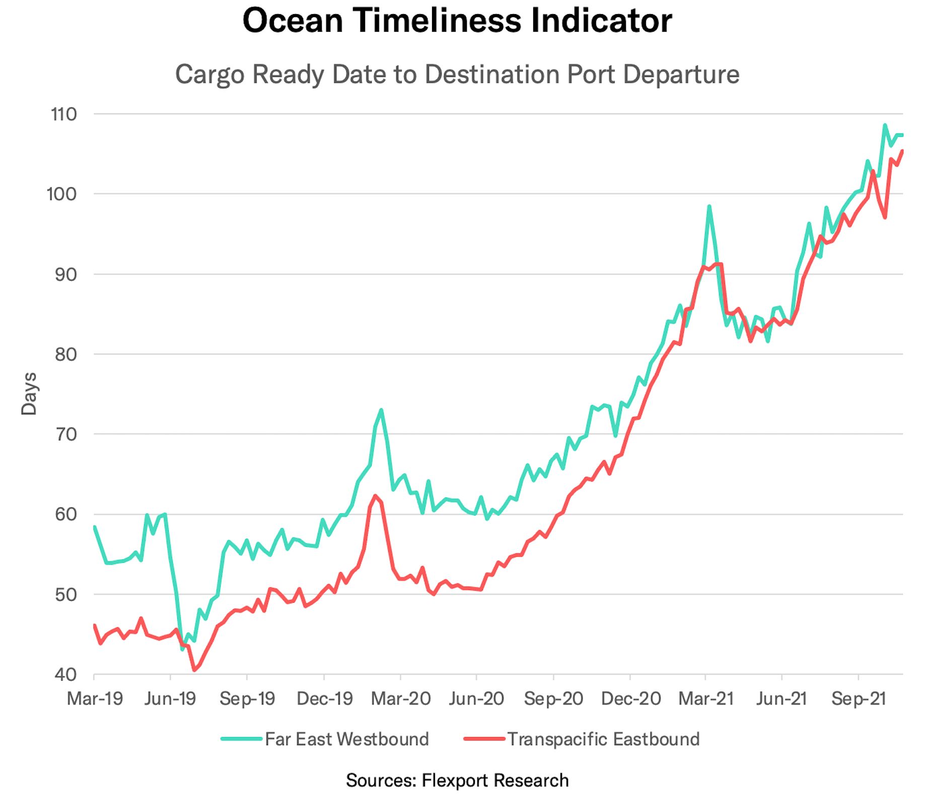 Flexport’s new Ocean Timeliness Indicator measures the amount of time taken to ship freight from the point at which cargo is ready to leave the exporter to when it is collected from its destination port. The ocean shipping world tends to run along “trade lanes.” The two biggest ones carry goods from Asia to North America, and from Asia to Europe. The OTI captures timeliness on each of these. The Transpacific Eastbound (TPEB) measure hit its longest on record in the last week of November while the Far East Westbound (FEWB) measure is near its October high.