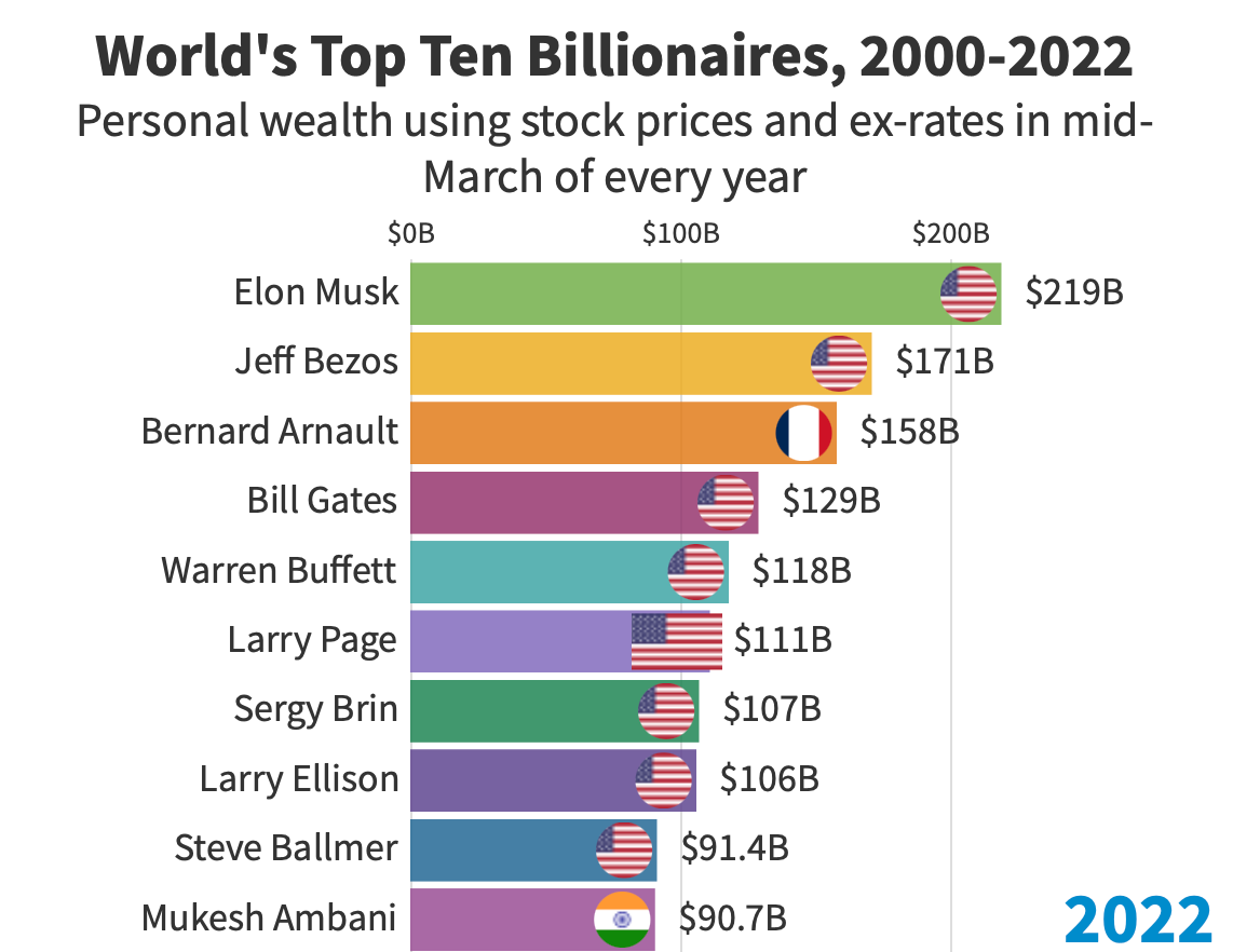 Animated chart: World’s top 10 billionaires, 2000 to 2022. Click the chart for the animated version.