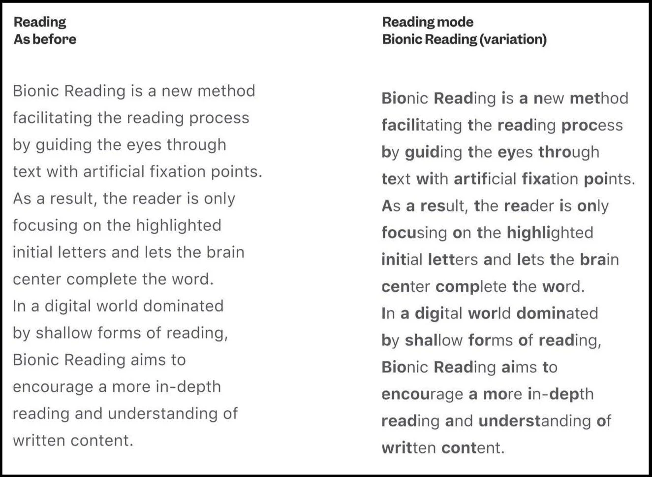 Text on right: “Bionic Reading” text with specifically bolded letters.