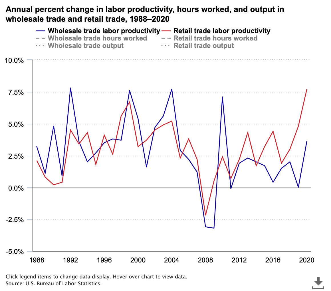 Labor productivity up 7.7 percent in retail trade and 3.6 percent in wholesale trade in 2020: