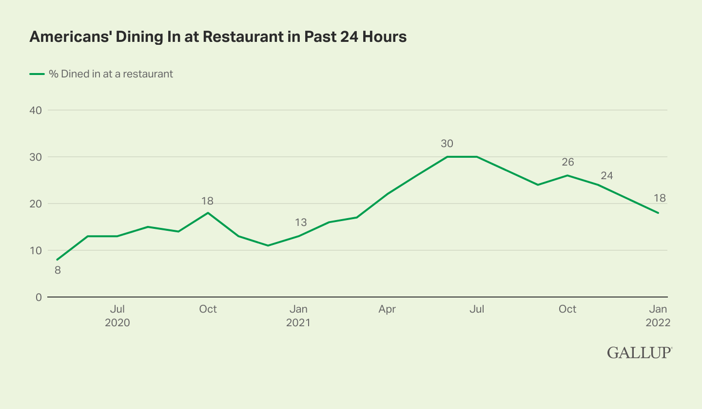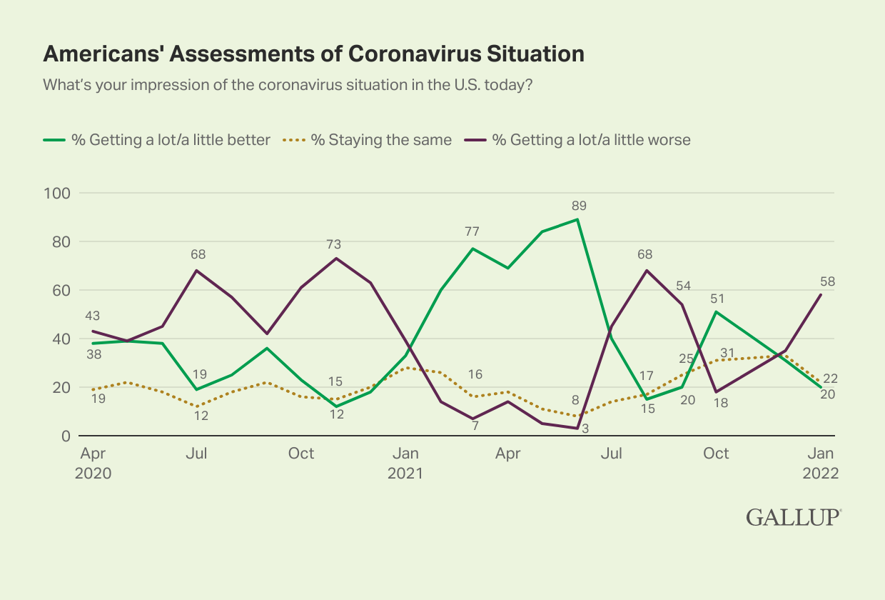 With the highly transmissible omicron variant of COVID-19 infecting hundreds of thousands of Americans daily, optimism about the trajectory of the pandemic in the U.S. has fallen sharply, and worry about contracting the virus has risen to its highest level in a year. The latest update to Gallup's COVID-19 data, from a survey conducted Jan. 3-14, finds U.S. adults' social distancing behaviors have picked up, and the use of masks in public remains high.