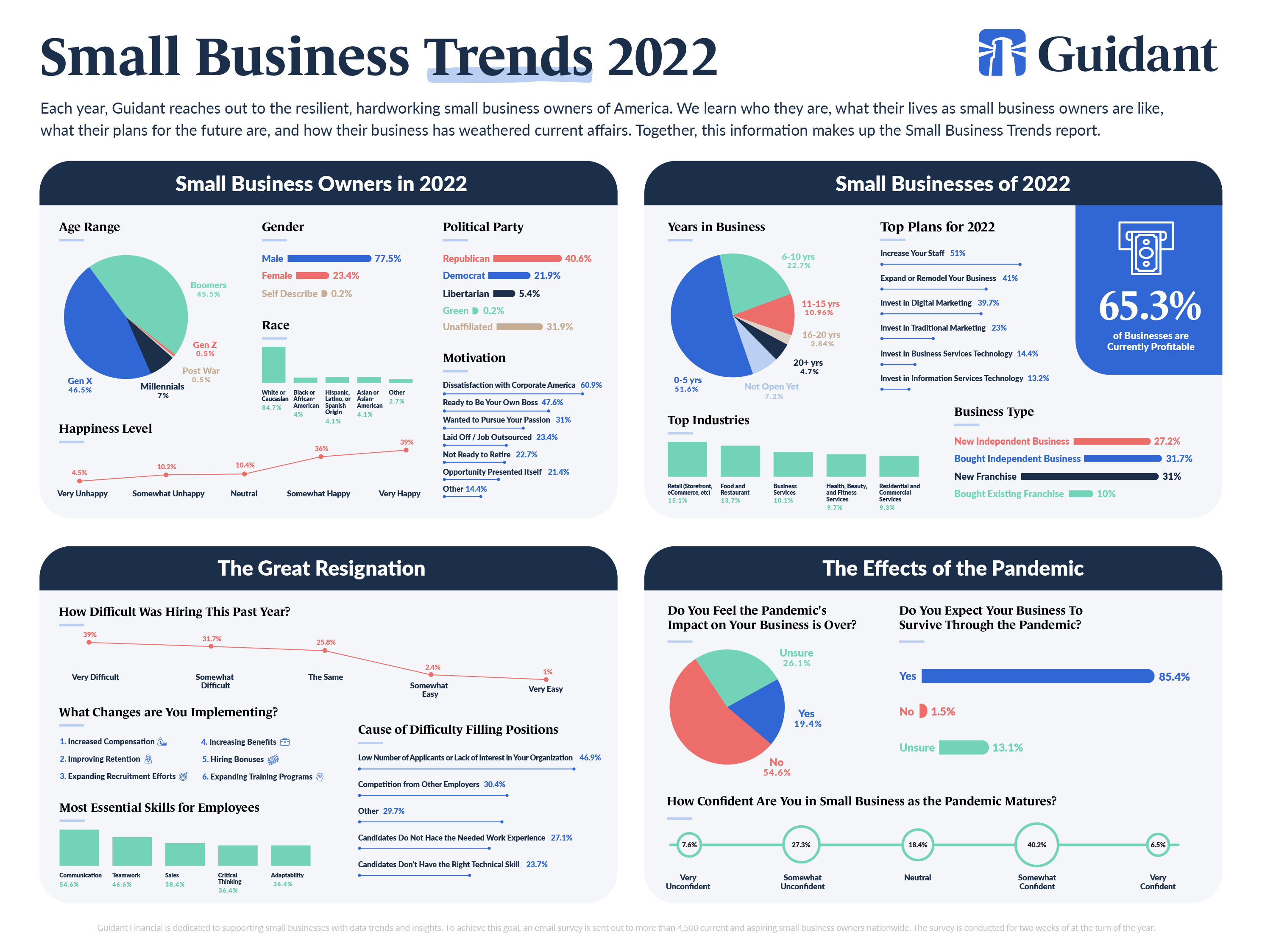 A look at the state of small business in 2022: Each year, Guidant reaches out to the resilient, hardworking small business owners of America. We learn who they are, what their lives as small business owners are like, what their plans for the future are, and how their business has weathered current affairs. Together, this information makes up the Small Business Trends report.