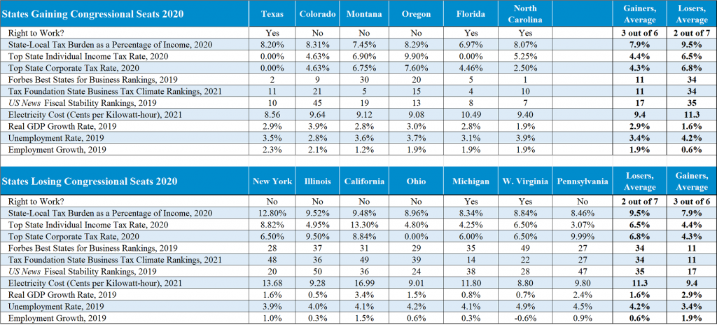 The six states that gained congressional seats vs. the seven states that lost seats: how do they compare on a variety of measures?