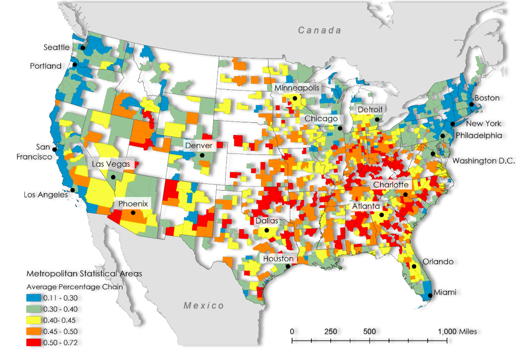 The cities where chain restaurants dominate: