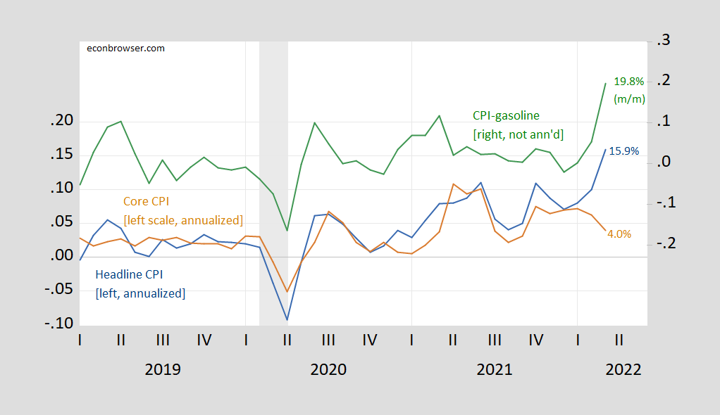 Month-on-month annualized CPI inflation (blue, left scale), Core CPI inflation (brown, left scale), and CPI gasoline component inflation, not annualized (green, right scale). NBER defined recession dates peak-to-trough shaded gray.