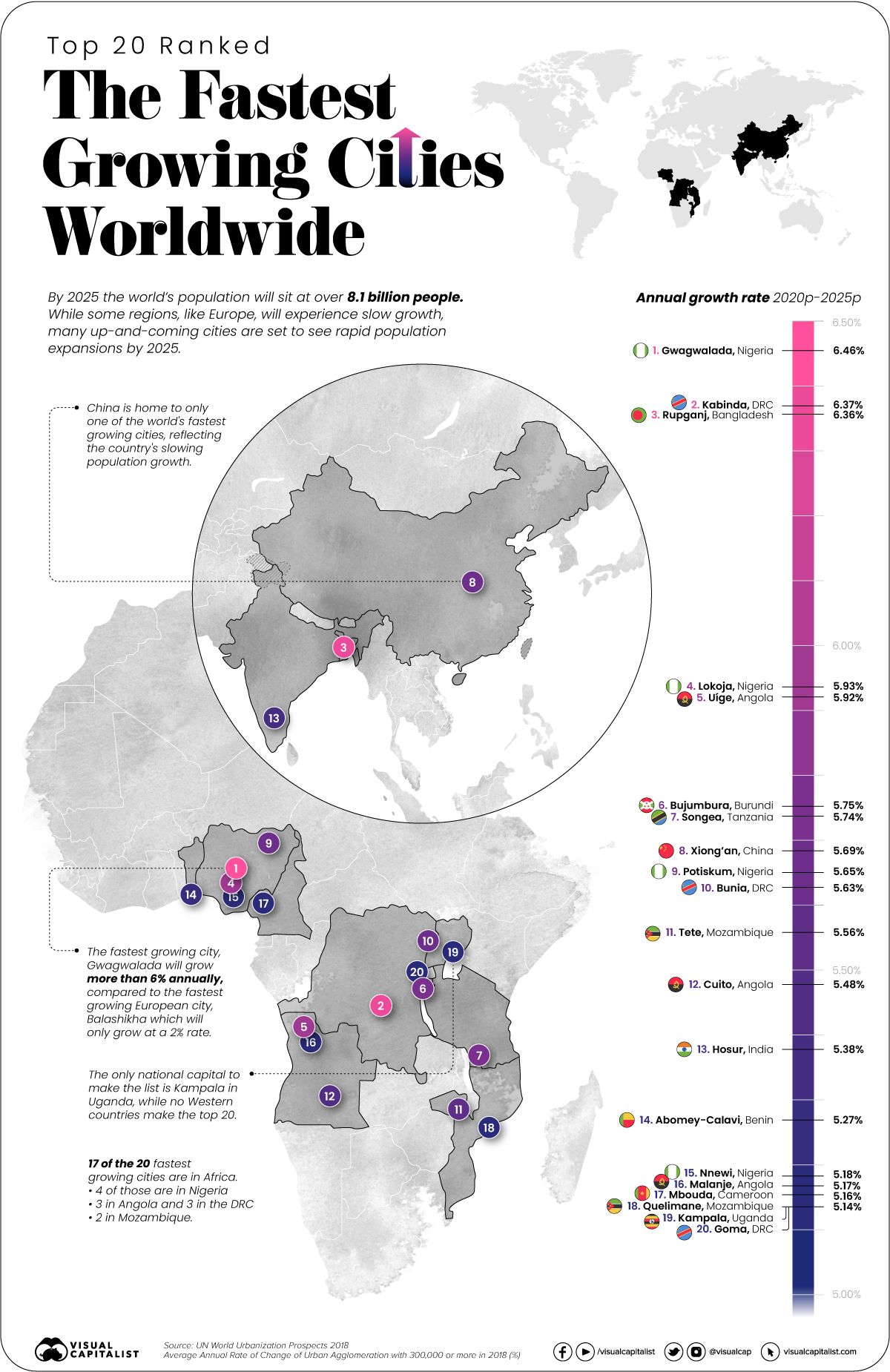 Fastest growing cities, worldwide - none of them are in Europe or the Americas:
