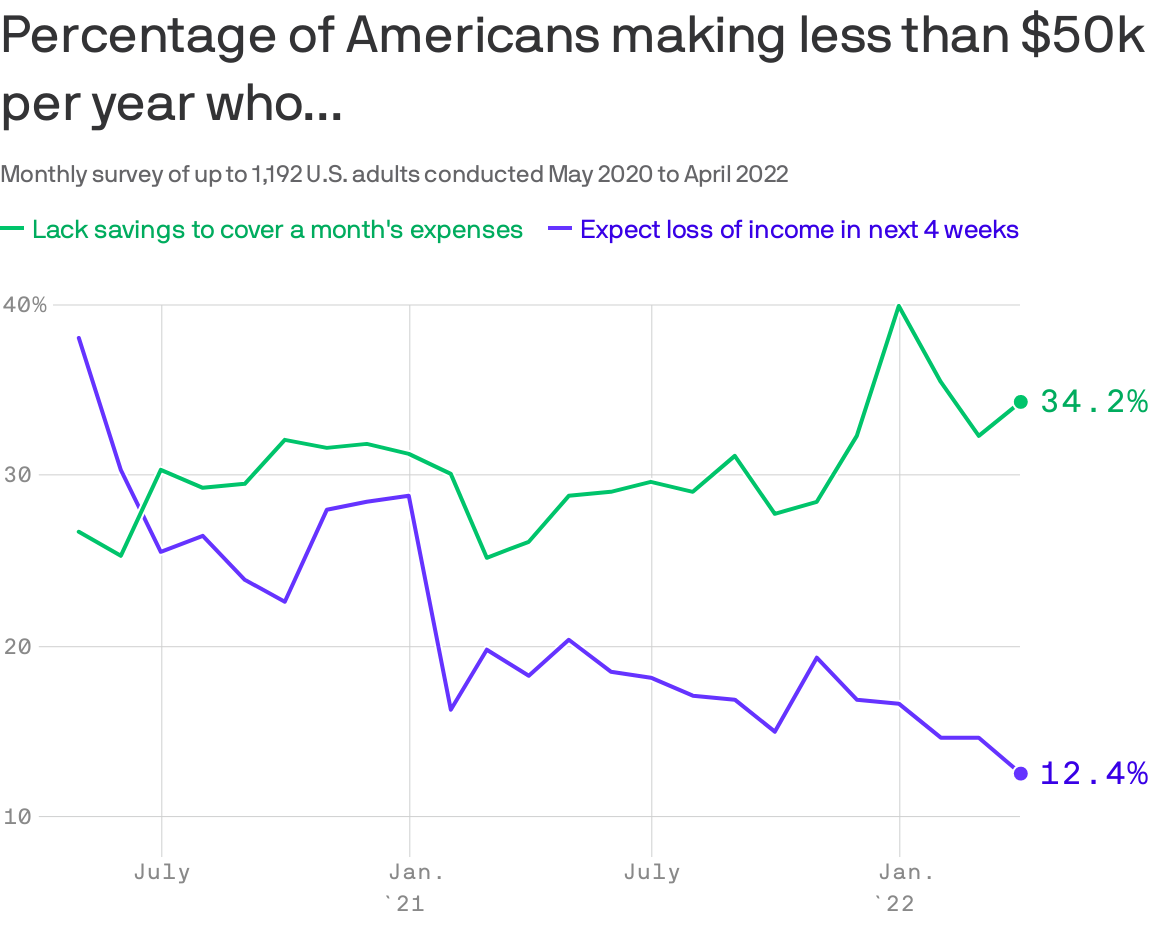 But this is good news: The share of adults making less than $50,000 per year who are worried about losing income over the next month hit its lowest point (12.4%) since May 2020: