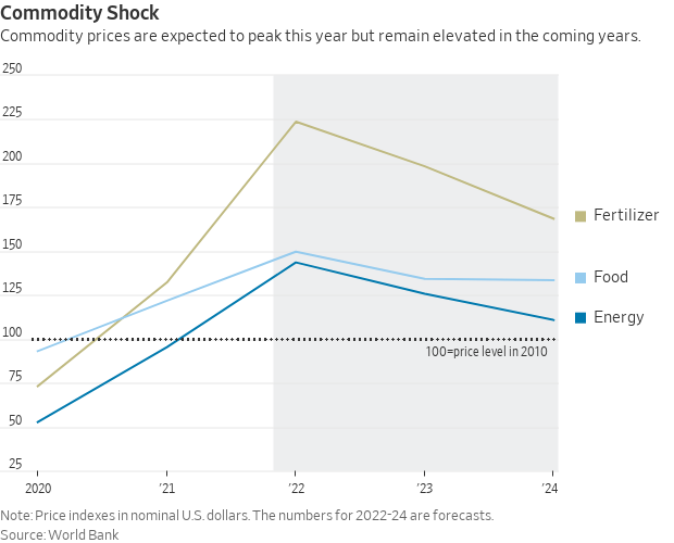 In its latest Commodity Markets Outlook report, the World Bank predicts that energy prices will soar 50.5% this year from last, after nearly doubling in 2021. Food prices are projected to rise 22.9% this year after rising 31% last year.