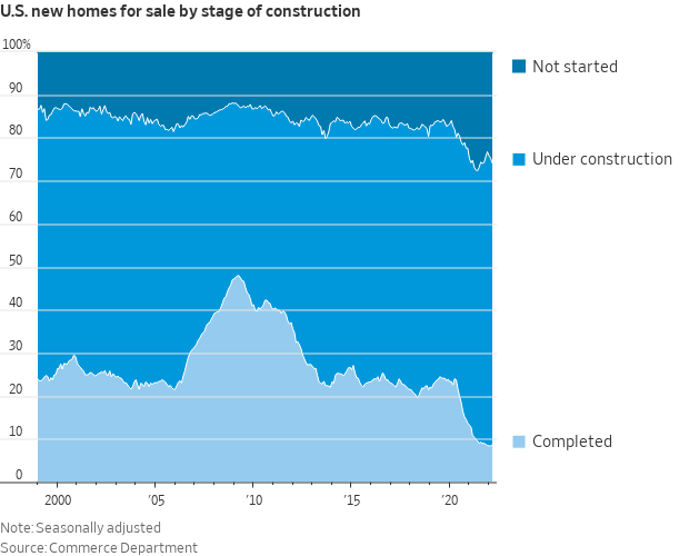 The share of homes for sale that have not yet been started or are under construction is historically elevated, suggesting that homebuilders are taking longer both to start and finish projects amid supply shortages, rising material prices and competition for workers.