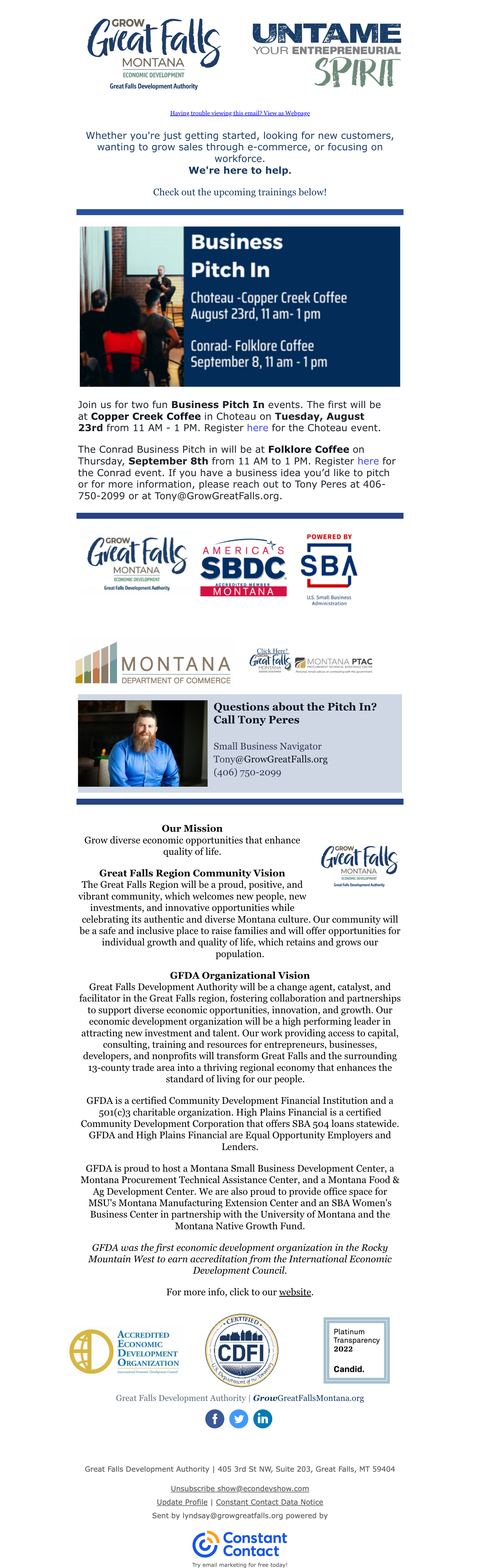 Carlsen Center for Innovation & Entrepreneurship, Fort Collins Business Newsletter, Fort Worth Chamber, Georgina Economic Development & Tourism, Great Falls Development Authority, and more.