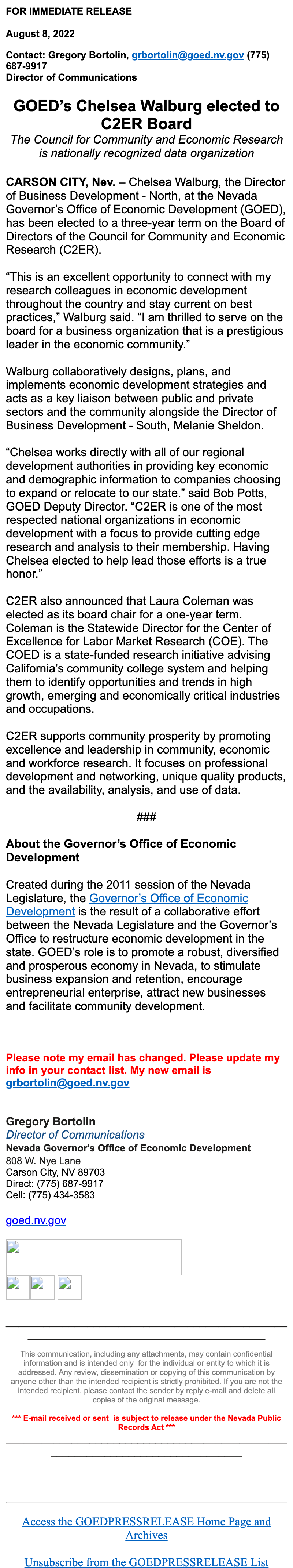 “Chelsea works directly with all of our regional development authorities in providing key economic and demographic information to companies choosing to expand or relocate to our state.” said Bob Potts, GOED Deputy Director. “C2ER is one of the most respected national organizations in economic development with a focus to provide cutting edge research and analysis to their membership. Having Chelsea elected to help lead those efforts is a true honor.”