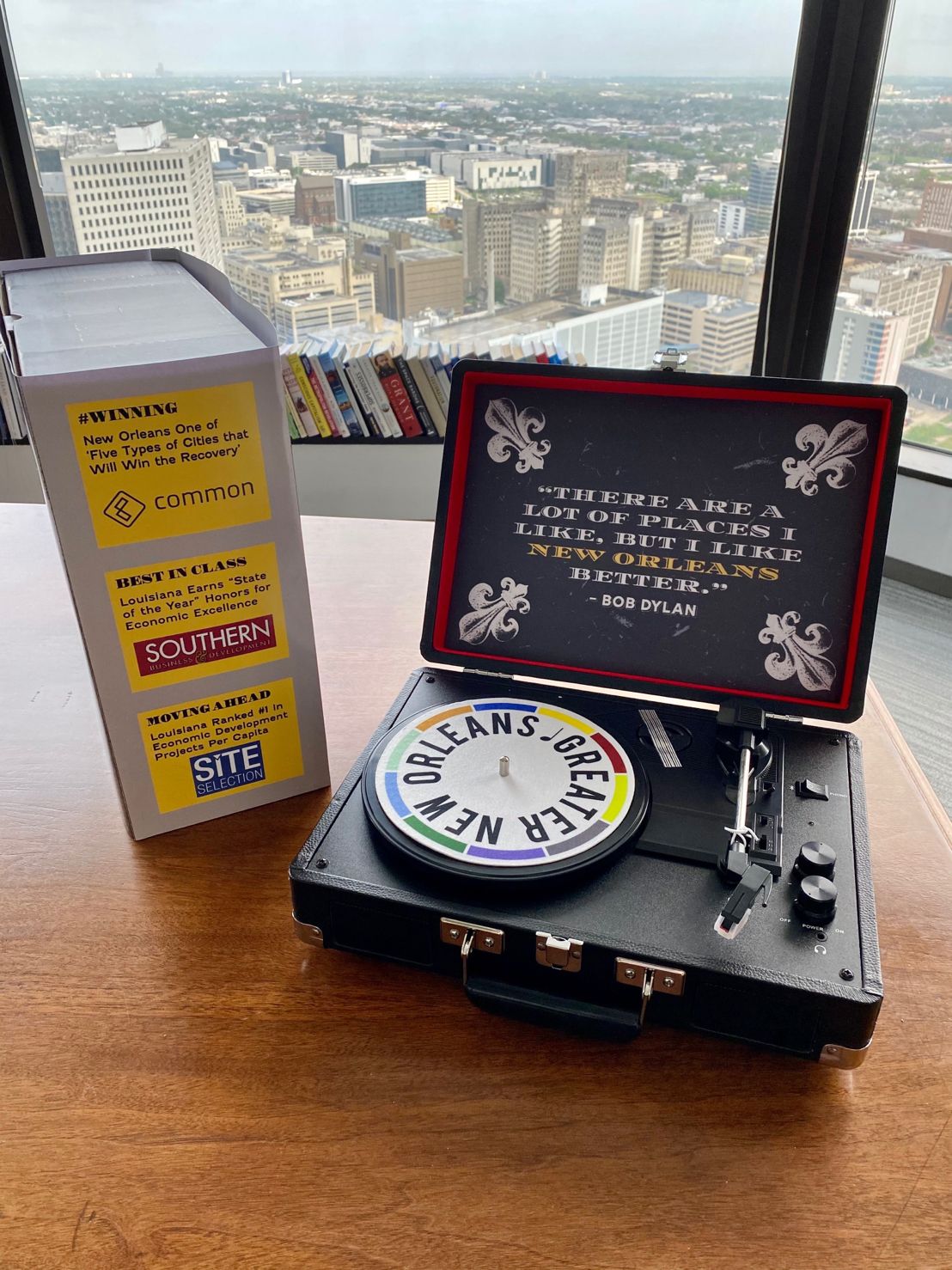 Earlier this year, Grady Fitzpatrick came into work with a big idea: just because concerts weren’t happening in New Orleans, it didn’t mean that people who live around the country couldn’t enjoy our music. So we put together a custom turntable with a GNO, Inc. logo on the outside, a famous quote about the city mounted on the inside, and a custom slipmat to remind them where it all came from. Then, we took the box and wrapped it in a brochure sleeve with market data and sent them to the top site selectors in the country (with a handwritten note).