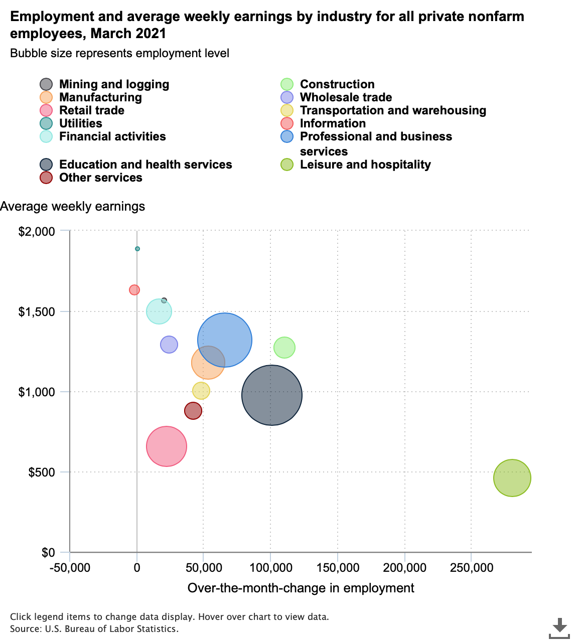 Total nonfarm payroll employment increased by 916,000 in March 2021. Job growth in March was widespread, with the largest gains occurring in leisure and hospitality and construction. Average weekly earnings for the private sector were $1,045.60 in March 2021. -BLS