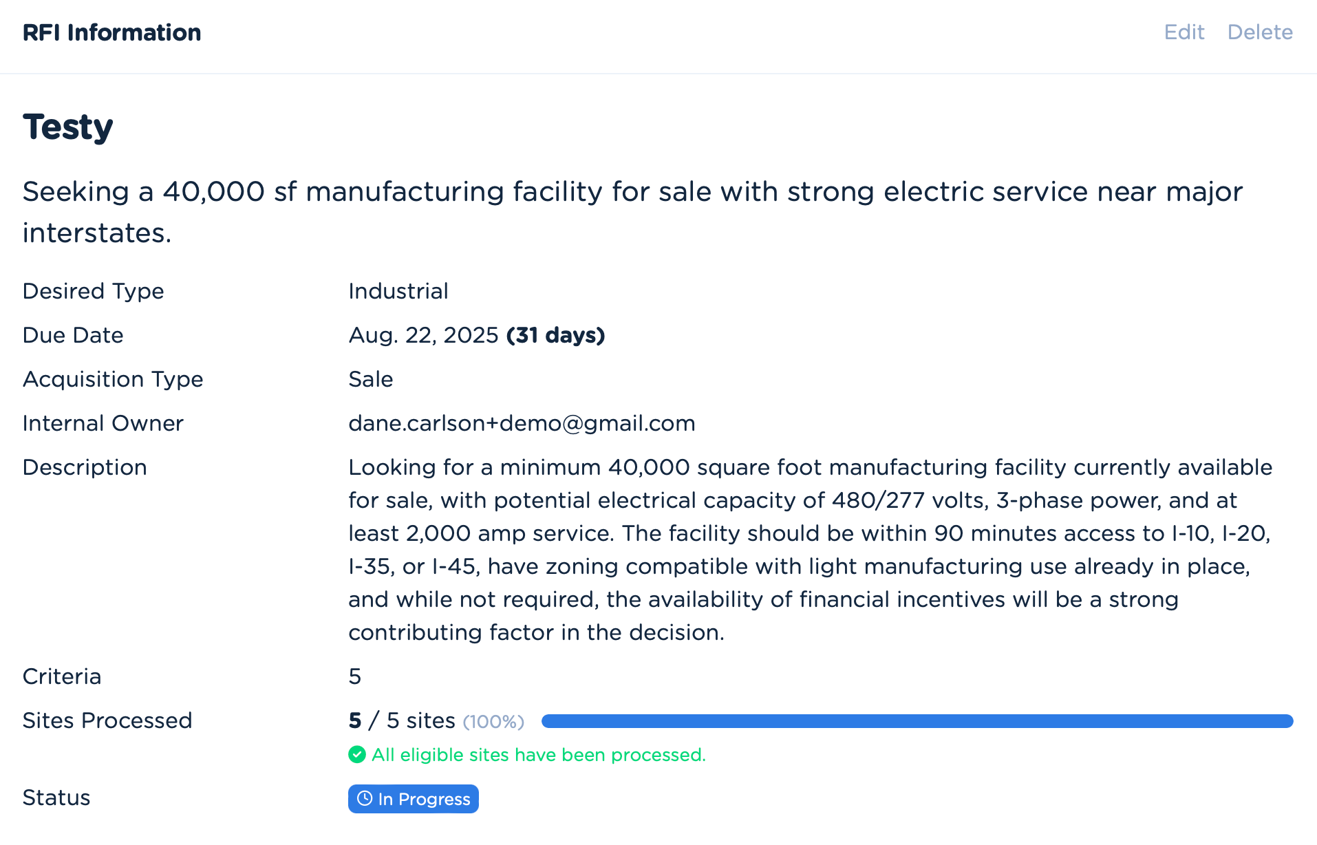 Spend your time selling your region, not herding responses. Load the RFI, let Sitehunt score your inventory, and hit Send. Your board will wonder where the downtime went. Your prospects will wonder how you moved so fast.