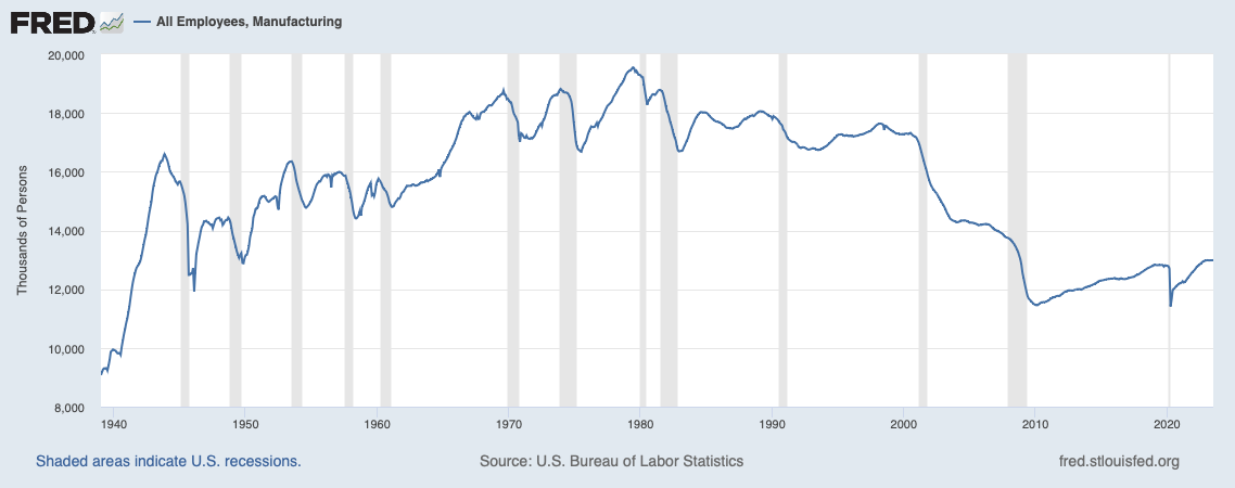 1) Notice these two graphs. The first shows the number of workers employed in manufacturing. Looks pretty low, doesn't it.