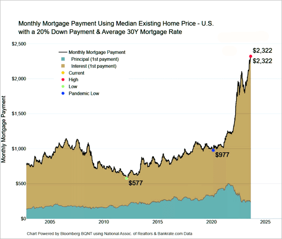 3) Blame the interest rates: The mortgage on a median home has increased 2.3x in the last three years.