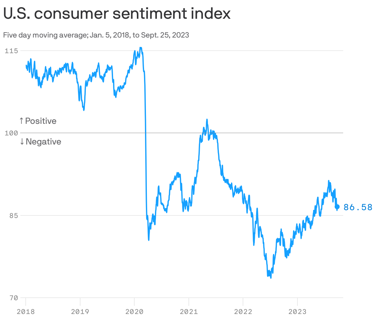 3) After rising for much of 2023, consumer sentiment fell in September: