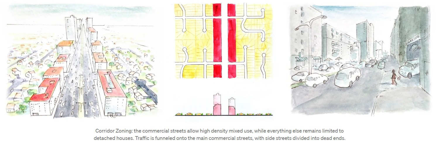 In many North American cities, as more housing is built, it's limited to a few places: downtown and along busy streets. This is known as Corridor Zoning…[Corridor Zoning] has downsides:Lots of people end up living on the noisiest, most polluted streets.Local businesses, historic buildings, and existing low-rent apartment buildings are at risk of demolition.Storefronts on the main street are replaced by garages, exit doors, private lobbies, utility rooms and other uninviting spaces.Limited number of sites causes land to be expensive.Narrow canyon of tall buildings creates a wind tunnel, makes being outside on the main street unpleasant.