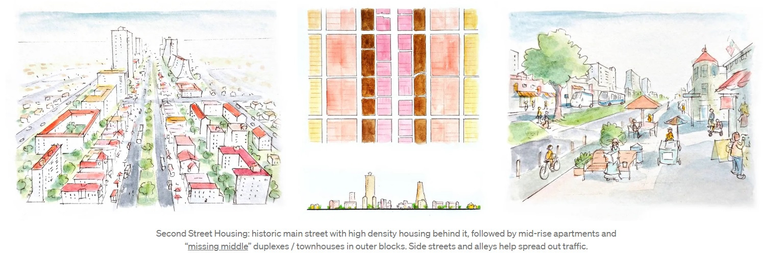Second Street Housing…puts the biggest new apartment buildings behind, not on top of, the main commercial strip, separated by an alley for deliveries. Further back, still within a five-minute walk, are mid-rise apartments, and beyond that, a mix of houses, duplexes, fourplexes and courtyard apartments…In most places, Second Street housing can be implemented by rezoning the land closest to commercial zones.
