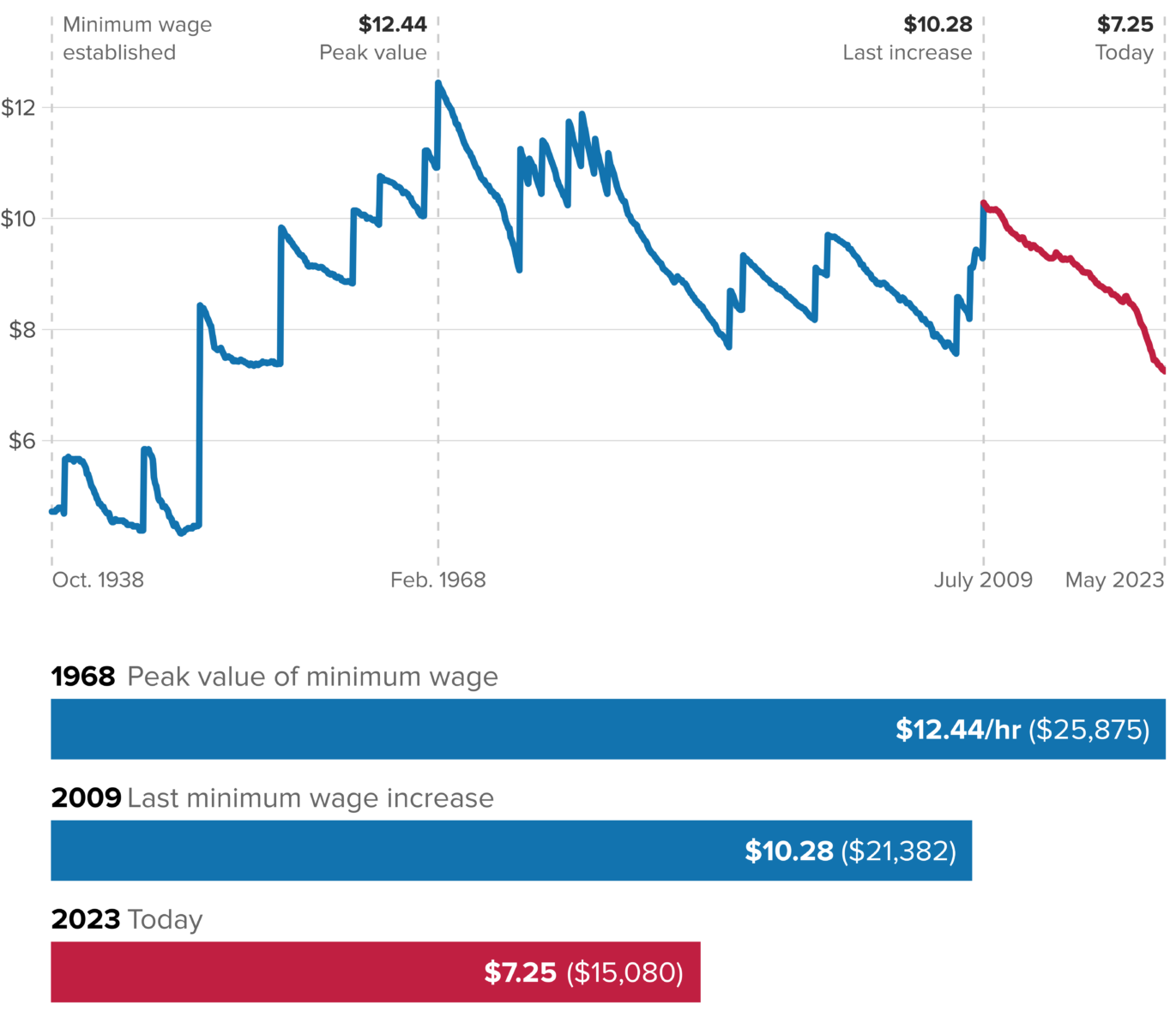 3) The buying power of the federal minimum wage is at its lowest point since December 1949: