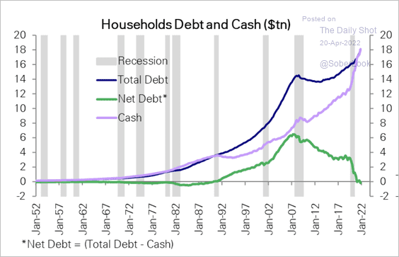 19) Household cash exceeds debt for the first time in 30 years: