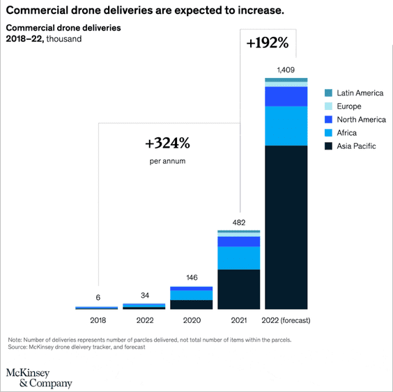 Commercial deliveries via drone topped 600,000 globally in the past three years. Experts predict there will be as many as 1.5 million drone deliveries in 2022, distributing everything from pizzas to medical supplies.