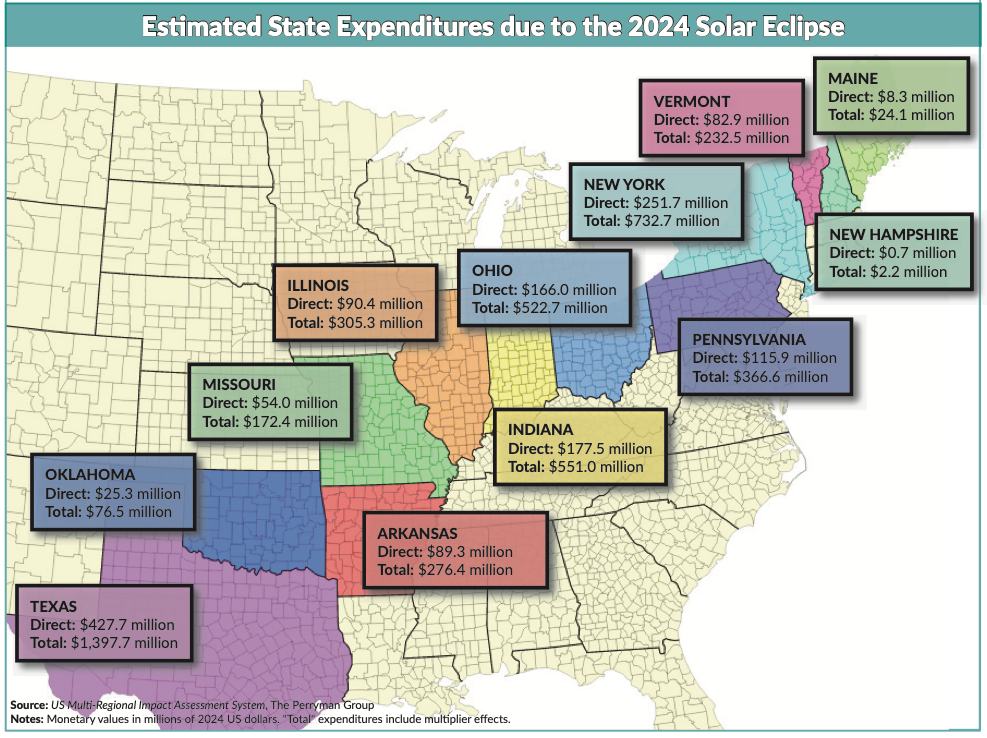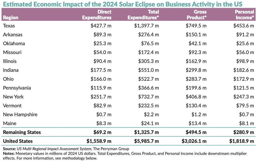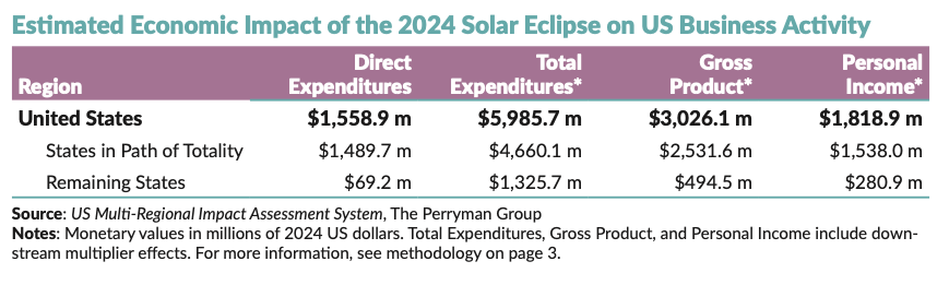 Solar eclipses offer more than just a once-in-a-lifetime celestial show; they provide economic boosts to cities, towns, and villages in their path. How much? The Perryman Group ran the numbers: